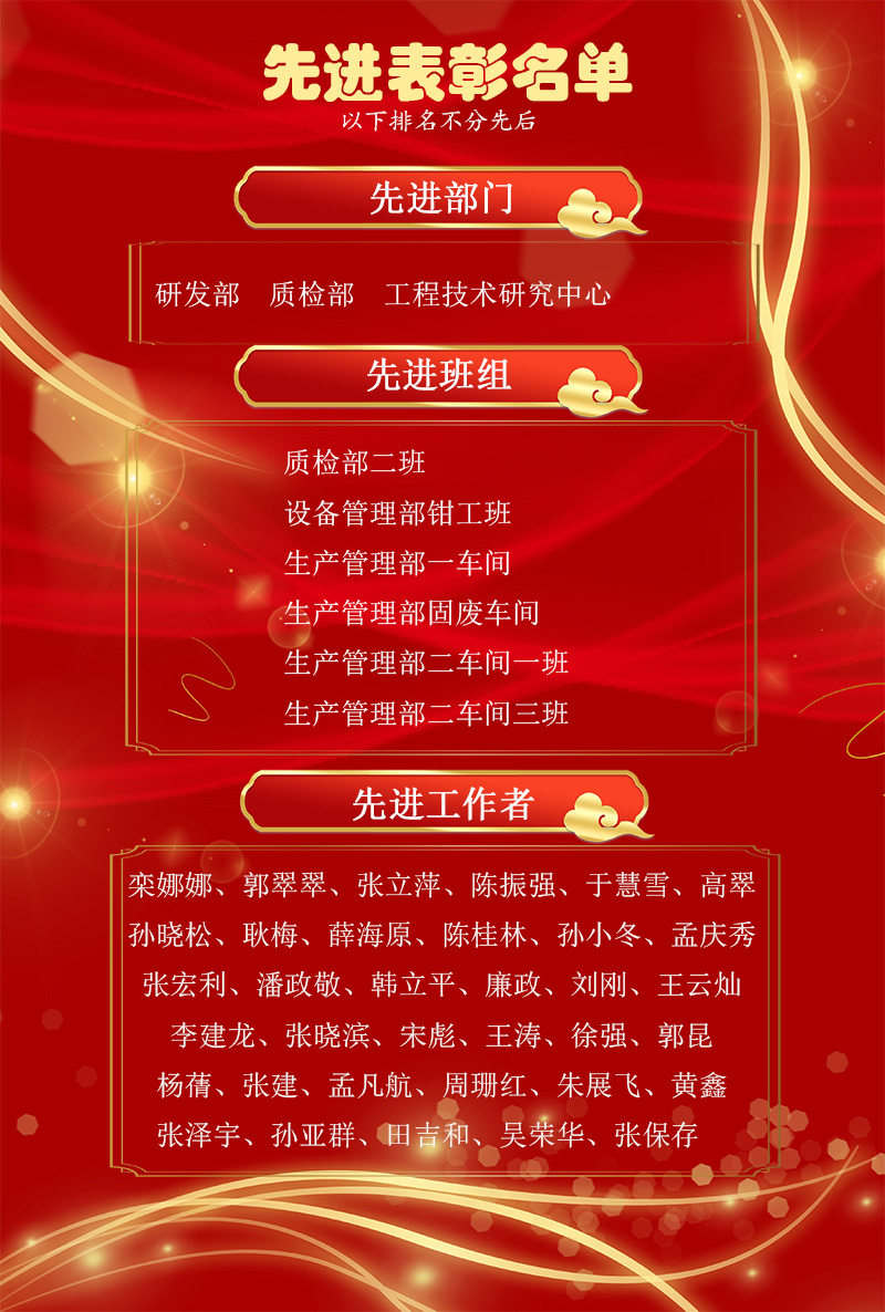 為表彰先進(jìn),樹(shù)立楷模,1月24日下午,公司2021年度先進(jìn)表彰儀式在研發(fā)中心會(huì)議室隆重舉行,儀式現(xiàn)場(chǎng)對(duì)先進(jìn)工作者、先進(jìn)班組、先進(jìn)部門(mén)進(jìn)行表彰嘉獎(jiǎng)。公司董事長(zhǎng)、總經(jīng)理張新功,公司各級(jí)經(jīng)營(yíng)管理干部及先進(jìn)工作者、先進(jìn)班組及部門(mén)代表參加了儀式。